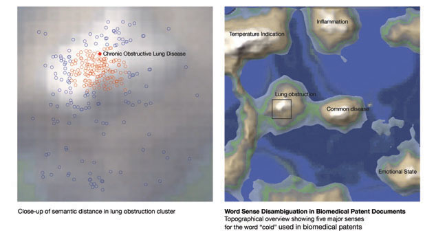 Semantic Landscape 1. This visualization gives the overall field of inquiry for the word "cold" along with a close-up of patent document nodes within a particular cluster group.