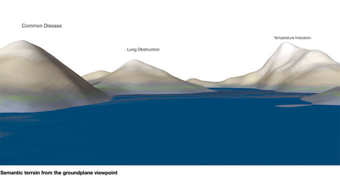 Marc Weeber's paper on "Developing a Test Collection for Biomedical Word Sense Disambiguation" gives the following three senses of the term "cold": 1) temperature indication, 2) the acronym for Chronic Obstructive Lung Disease, and 3) a common disease. The semantic landscape at right investigates this example of sense disambiguation among US Patent documents.