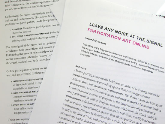 | ABSTRACT Online participatory media holds the promise of activating otherwise passive audiences by providing spaces that encourage creative collaboration among diverse participants. The thesis traces the history of participation in artistic movements and early networked communication to contextualize a series of projects at the intersection of performance and participation online. Projects include WikiPhone, in which multiple participants collaborate on soundtracks in real-time, modifying existing online videos; OpenBrand, a system that allows participants to rewrite advertisements; Emma On Relationships, a video blog inviting participants to call in for love advice; and several other projects, exploring aspects of creativity and collaboration. Commonalities within these systems are examined in order to define design principles governing the creation of participatory media, and to explore the potential of these systems to effect social and political change. |